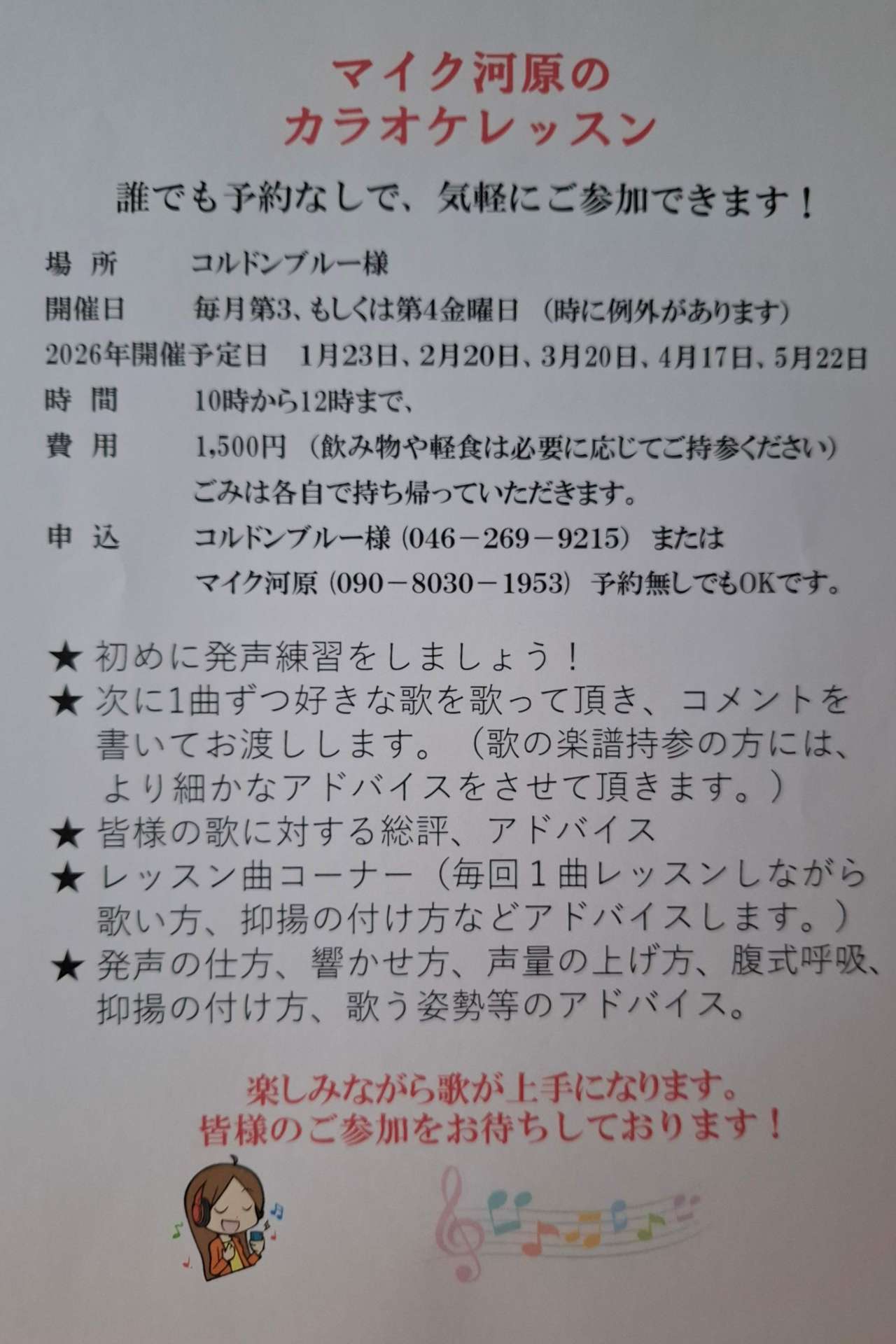 5月15日 コルドンブルー様、カラオケレッスン、 10時から12時まで、会費1,500円。