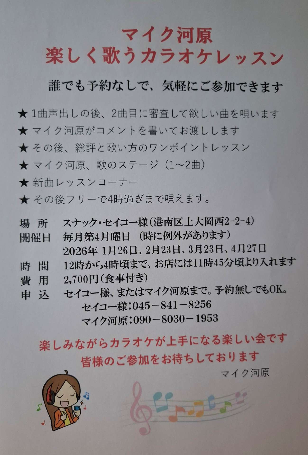 5月25日 「マイク河原と楽しく歌うカラオケレッスン」 横浜市上大岡「スナックセイコー様で。
