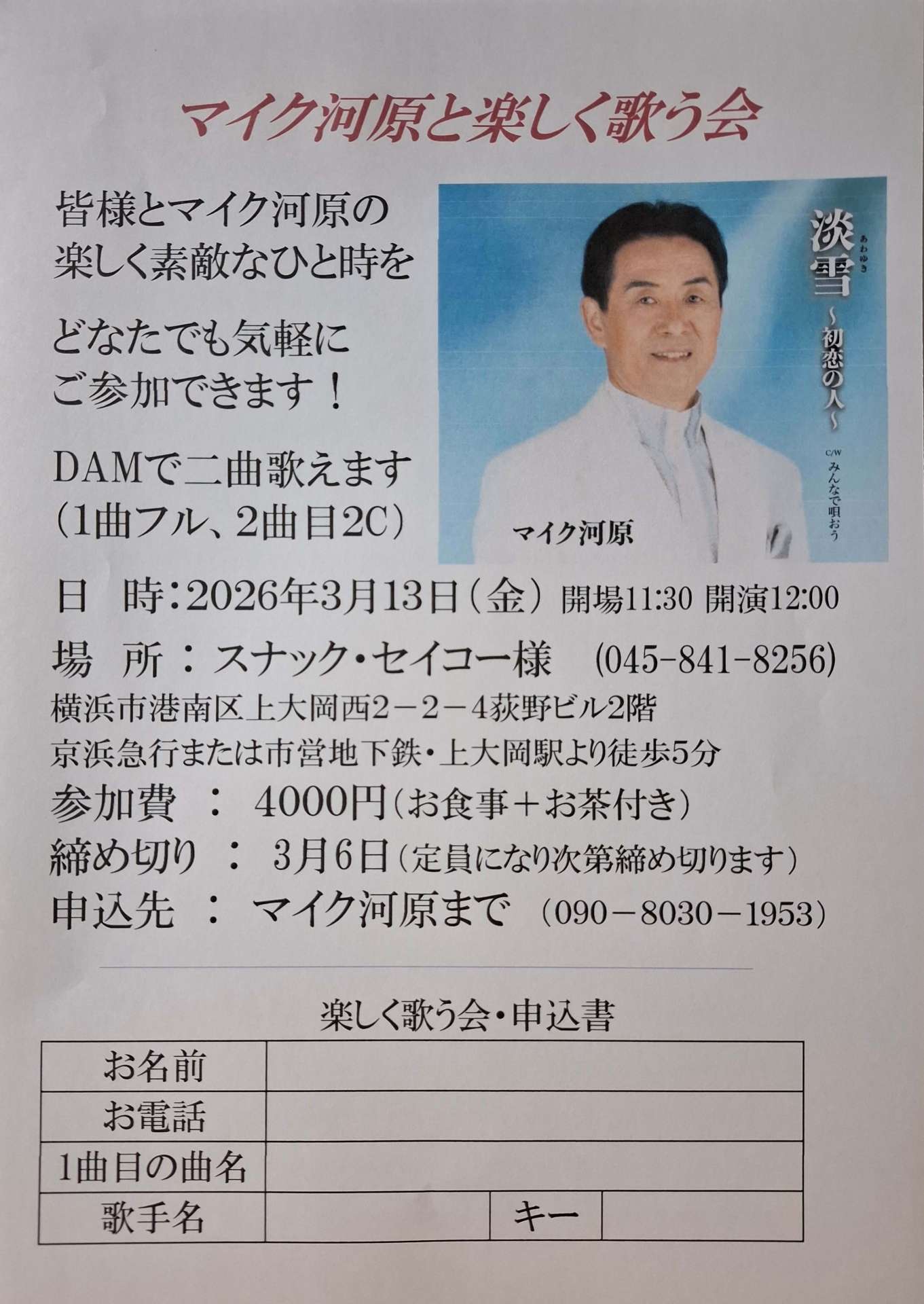 3月13日 「マイク河原と楽しく歌う会」 横浜市・上大岡の「スナック・セイコー」様で。